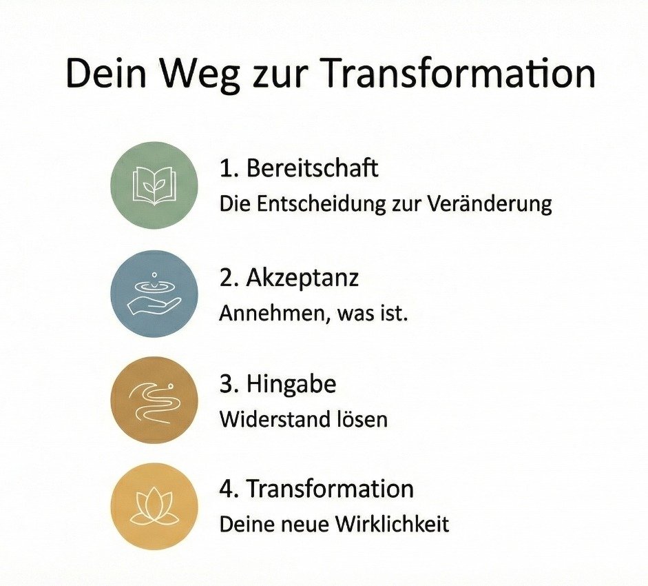 Das ist ein natürlicher Teil des Prozesses. Transformation ist kein Schalter, der einmal umgelegt wird, sondern eine Neuausrichtung. Genau deshalb bekommst du von mir konkrete Übungen an die Hand. Sie helfen dir, dich selbst immer wieder in die Akzeptanz und Hingabe zurückzuholen, bis das neue Muster stabil ist.